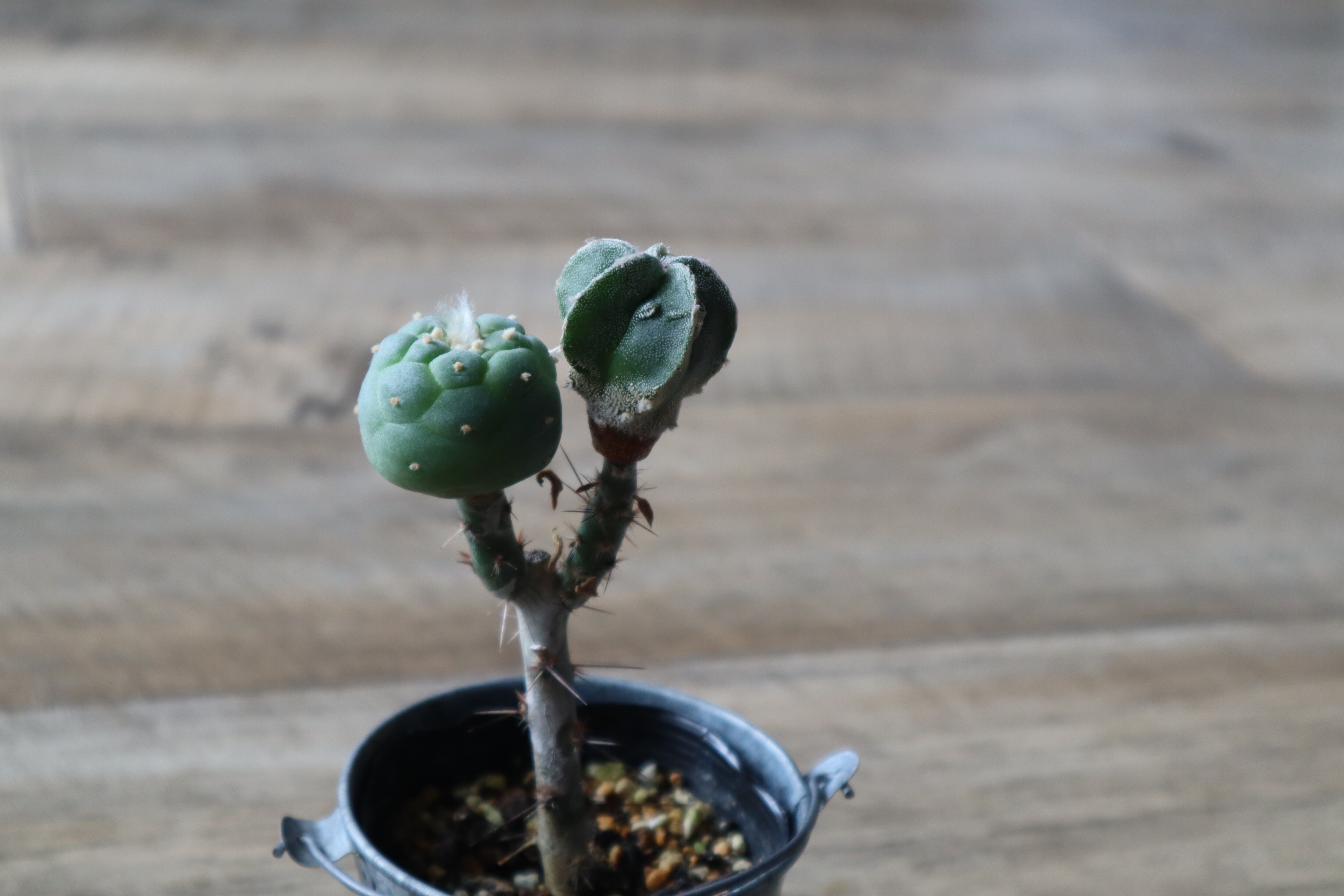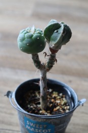 ロフォフォラ 疣銀冠玉(Lophophora fricii)と白条複隆鸞鳳玉という希少種の実生接木品です。